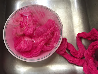 The longer you leave the cotton cheese cloth in the water dye the colors will look more rich and vibrant. Don’t be afraid to leave it over night I have done that. Once you are happy with the color dip. Take the fabric off the fabric dye and wash all the excess dye under running cold water. Then rinse it again with your favorite smelly detergent soap and rinse again it under very cold water.