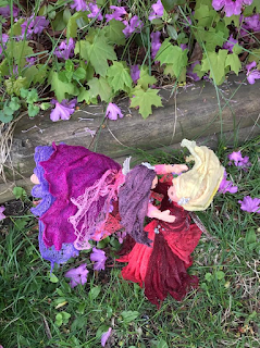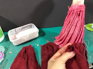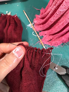 I used two different shades of burgundy dye fabrics. they were both dyes with the same color but one was left more than the other in the dye. Cut three pieces of each shade for volume.