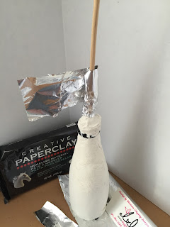 To cover the bottle with Creative Paperclay Material® roll a sheet 1/4 thick and cover the bottle entirely. Cover the top of the bottle and secure the wooden dowel. Set aside to dry.