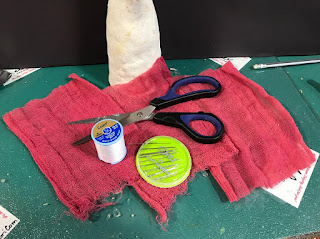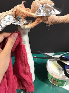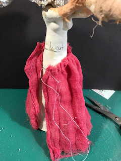Cut the cheese cloth in workable strips. Soak one and wrap the Paverpol® soak up fabric around the doll extremities tight to shape the legs, hands and head.