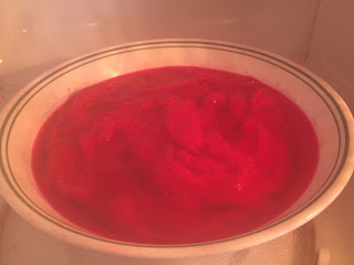 Start by cut a good length of the cheese cloth. I personally like to cut approximately a yard at the time and set the yard in a big deep glass bowl. Cover it completely with the dye ration mixture of your choice and heat in the microwave. I follow the dye manufacturer instructions specially for the